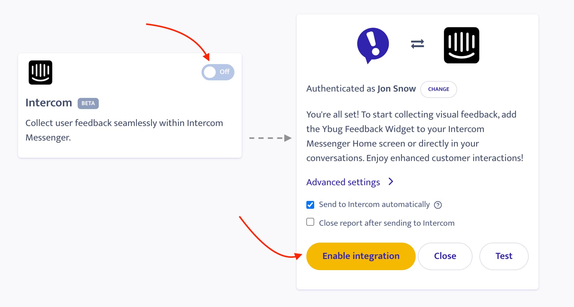 Navigate to your project settings in Ybug. Enable the Intercom integration for the selected project and authorize Ybug Feedback Widget to access your Intercom account. If you installed our app directly from Intercom Marketplace, you can just select a connection from a list of available Intercom connections.